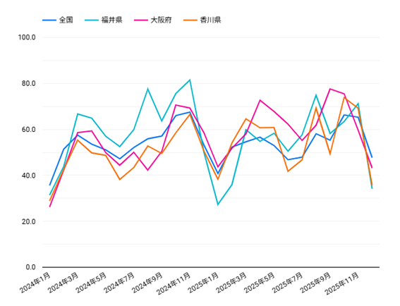 データサラダで収集分析している日次宿泊稼働指数※の12月集計値をプレスリリースいたしました。 2025年12月における全国の宿泊稼働指数は47.7で、前年差は-5.5ptとなり、2カ月連続で前年を...